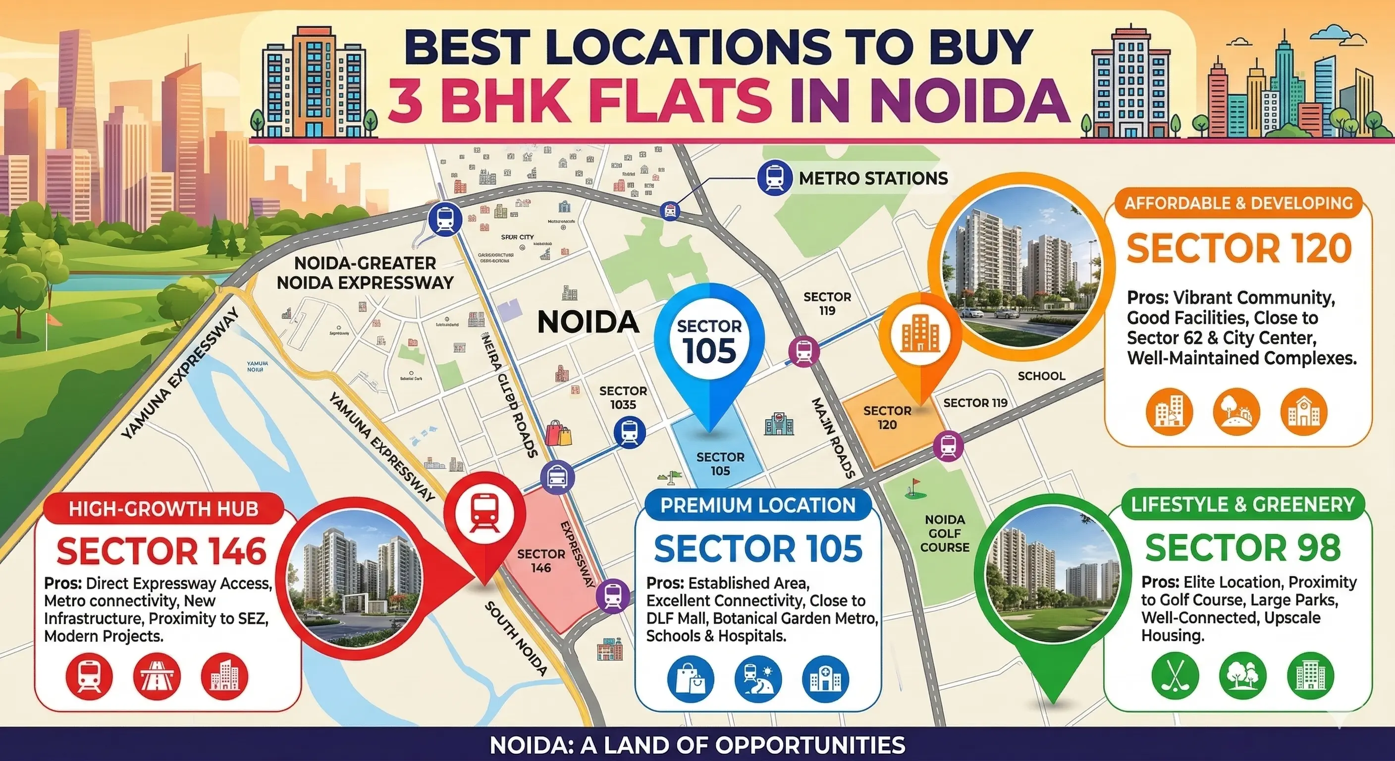 Noida consists of well-planned residential sectors, each offering unique advantages in terms of connectivity, infrastructure, and lifestyle facilities.